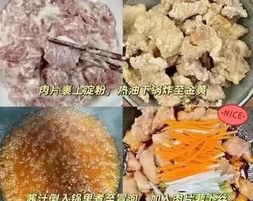 关键步骤:将猪肉切片,加姜丝、适量盐和少量小苏打腌制,用小苏打可以让成品的口感更为酥脆。再倒入1勺食用油锁住肉片的水分,腌30分钟。接着用土豆淀粉加水泡半小时,倒去多余水分,随后裹上肉片进行炸制,最后的成品金黄酥脆,每一口都让人欲罢不能。