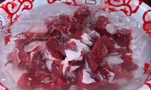 切好的牛肉需要浸泡,浸泡可是让牛肉软嫩的“高手招数”。将牛肉放入盆中,加入适量食盐、一勺白醋,再倒入清水,浸泡十几分钟。这一步的关键就在于盐和白醋的作用:盐能让牛肉里的血水充分渗出,而醋酸则能软化肉纤维,帮助炖出来的牛肉更软烂。浸泡后,再换清水彻底清洗一遍,就可以进行下一步了。
