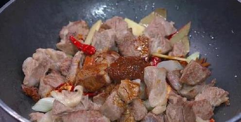 加完香料,紧接着就要调味了。放一勺黄豆酱,适量生抽,再翻炒均匀。炖牛肉的关键就在于让牛肉吸收调料的香气,这时候牛肉表面已经被浓郁的酱香味包裹,看起来就让人垂涎欲滴。