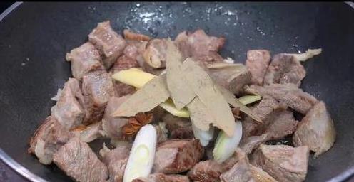 牛肉的香味出来后,就到了加入香料的步骤。炖牛肉的香料搭配很有讲究,葱姜是基础,加入两颗八角、一块桂皮,还有香叶和干辣椒提味。这里还有个绝妙秘诀:放几片山楂干!山楂中的有机酸能加速牛肉的软烂,去腥的同时还能增添一丝特别的风味,一次做菜两全其美。